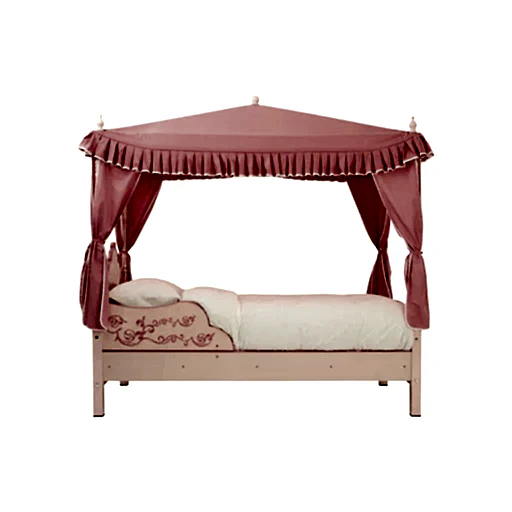 \nThis kids’ four-poster bed, complete with tester and covering curtains. It has high sides, and is decorated with a floral pattern, and a crown pattern on the headboard.