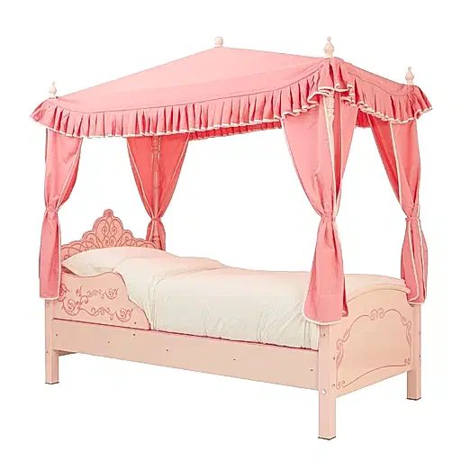 A children’s four-poster bed in pink, with a four poster design and curtains.